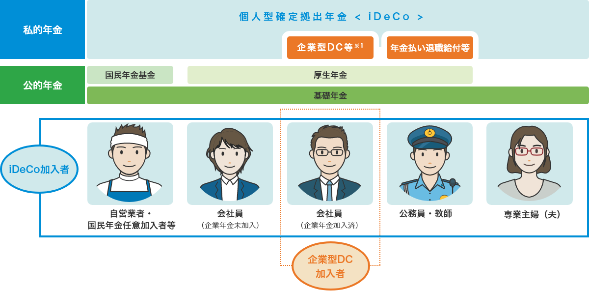 - ※1企業型DC等においてマッチング拠出(加入者が掛金を拠出)している場合、「iDeCo」には加入できません
