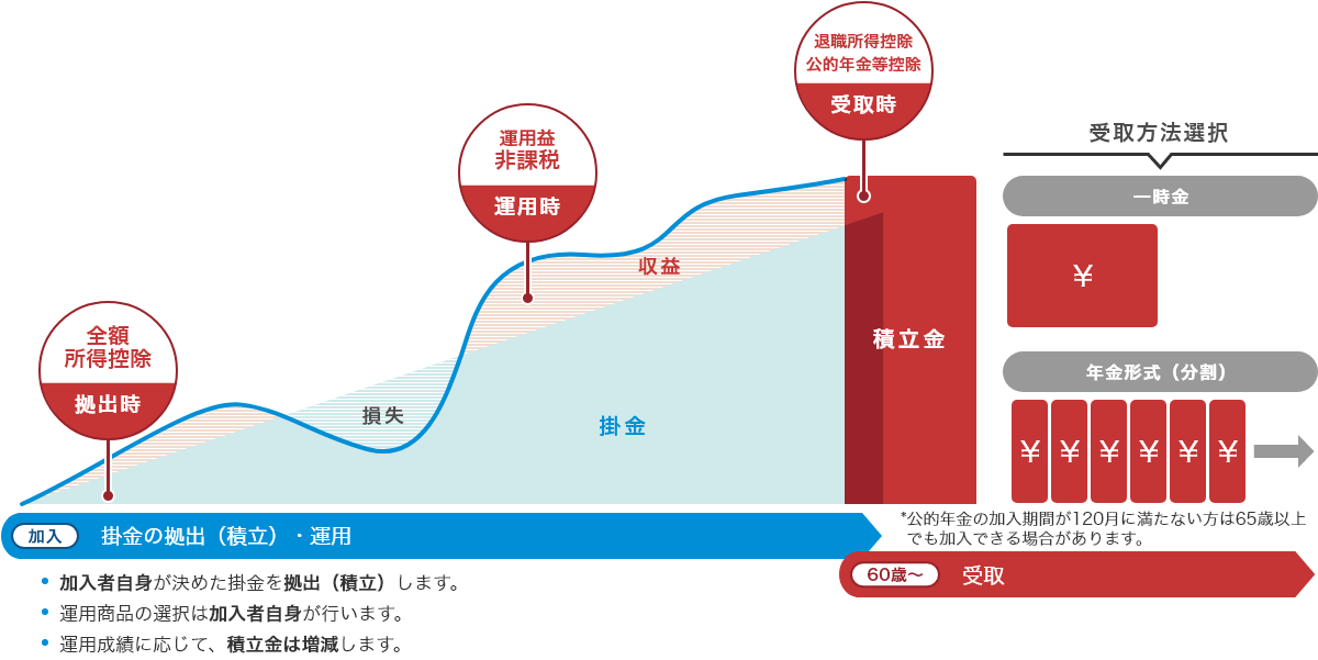 通常、金融商品の運用益には税金(源泉分離課税20.315%)がかかりますが、確定拠出年金の運用益は非課税です。 - 受け取るときも税制優遇措置があります。