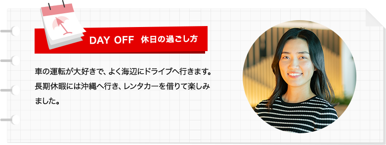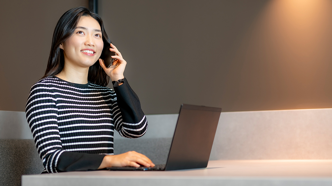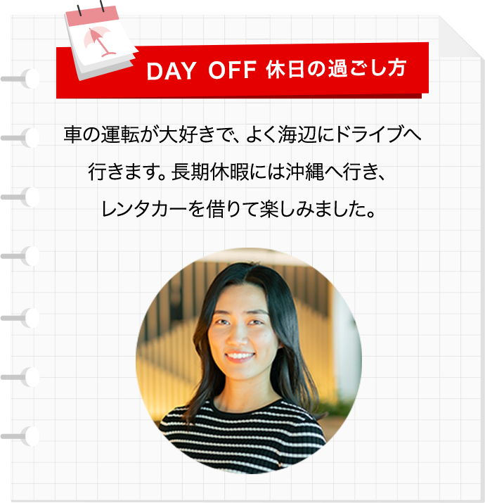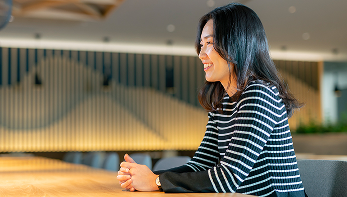 私は学生時代から「周りの人を喜ばせたい」という気持ちを原動力に、頑張れる性格です。今もお客さまに寄り添いながらお悩みを解決し、「ありがとう」と喜んでいただけることが一番のやりがいです。そのためのヒントを得られるのが、チーム内での何気ない情報交換や定例ミーティングです。チームの雰囲気を一言で表すなら、「和気あいあい」。安心できるコミュニケーションが、チーム内連携のベースになっています。
