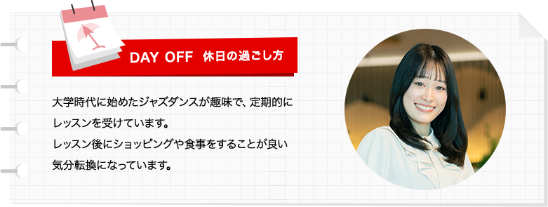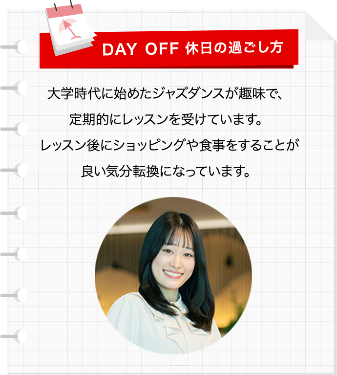 基本的に月単位の業務が多いので、自分で1ヶ月のタスク管理をしながらタイムマネジメントを徹底しています。ミーティングへの参加を重ねるごとに、必要とされる力が身についている手応えがあり、嬉しいです。正しい情報をいかに分かりやすく提示し、納得いただくか。一つひとつの契約規模も大きいため、緊張感がありますし、やりがいも感じます。今は仕事の幅を広げるチャンスだと思っているので、当社の自己啓発支援制度を活用して証券アナリストの資格取得を目指すとともに、ビジネス英語を学べる研修プログラムにも参加したいと思います。