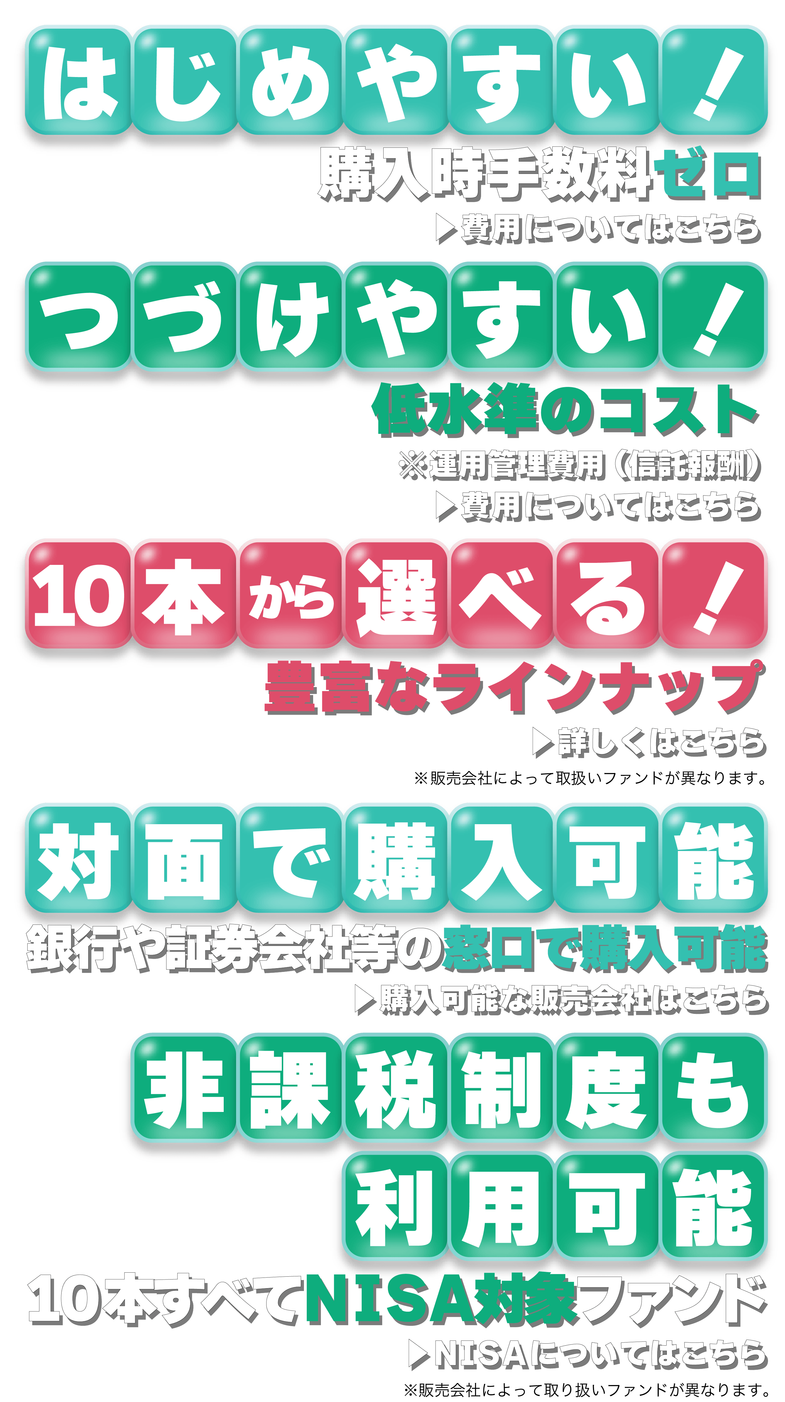 - ■つみたてんとうシリーズの各ファンドをNISAの対象ファンドとして販売していない場合があります。各ファンドのお取扱いに関しては各販売会社にお問合わせください。